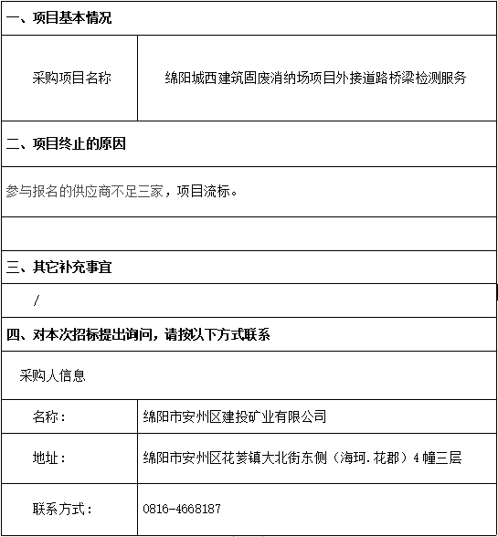 綿陽城西建筑固廢消納場項目外接道路橋梁檢測服務流標公告